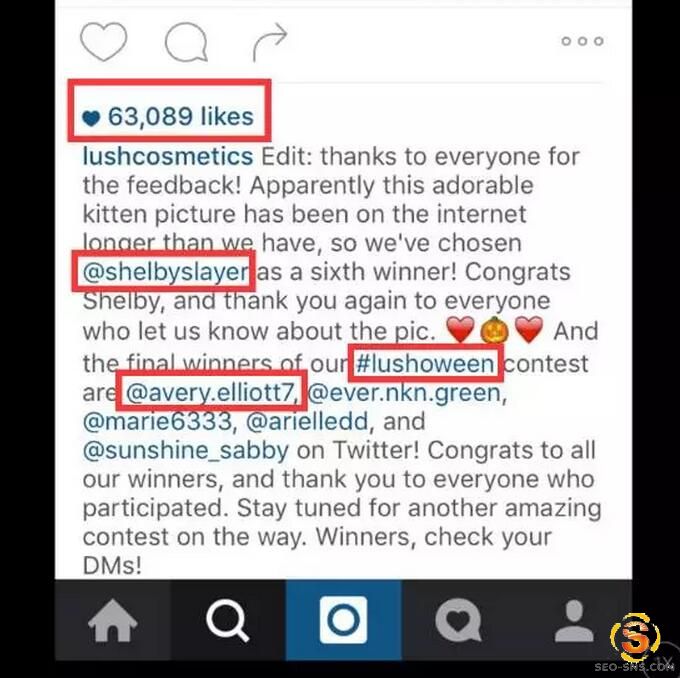 比如下图,是个比较小的品牌,但是他们在instagram上的营销做的很多也很成功,值得借鉴。他们选择分享一些品牌背后的图片,而这些图片恰恰是用户们喜欢的。并且在帖子的内容中加上简单的品牌#标签。如lushween,以及@一些参与活动的人。这样的方式提高了用户的参与度。